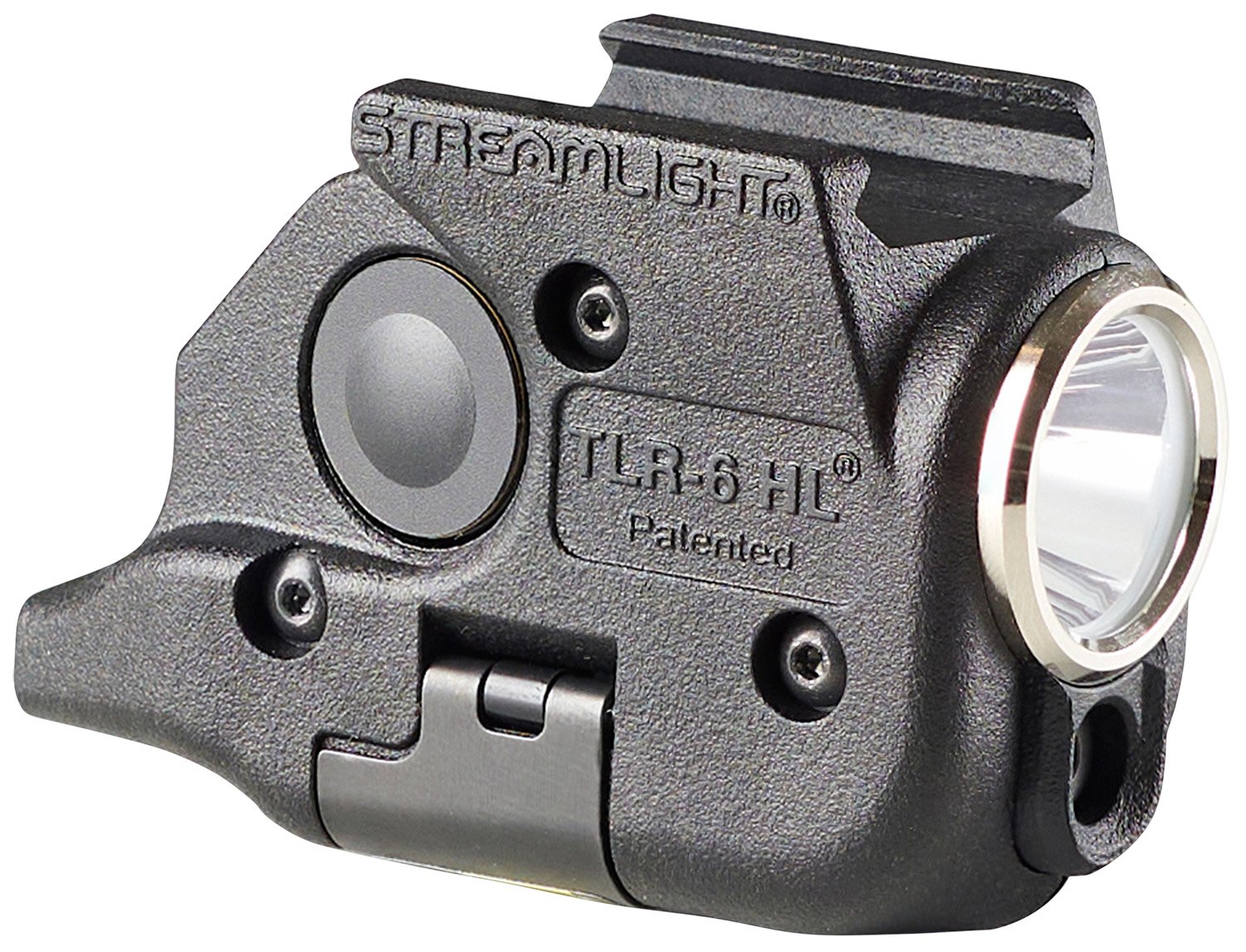The ultra-compact TLR-6 HL weapon light with high-power LED and integrated green aiming laser features tool-less rechargeable battery replacement without removal from the weapon or the need to re-sight the laser. Designed to securely attach to the rail and trigger guard of select subcompact handguns.