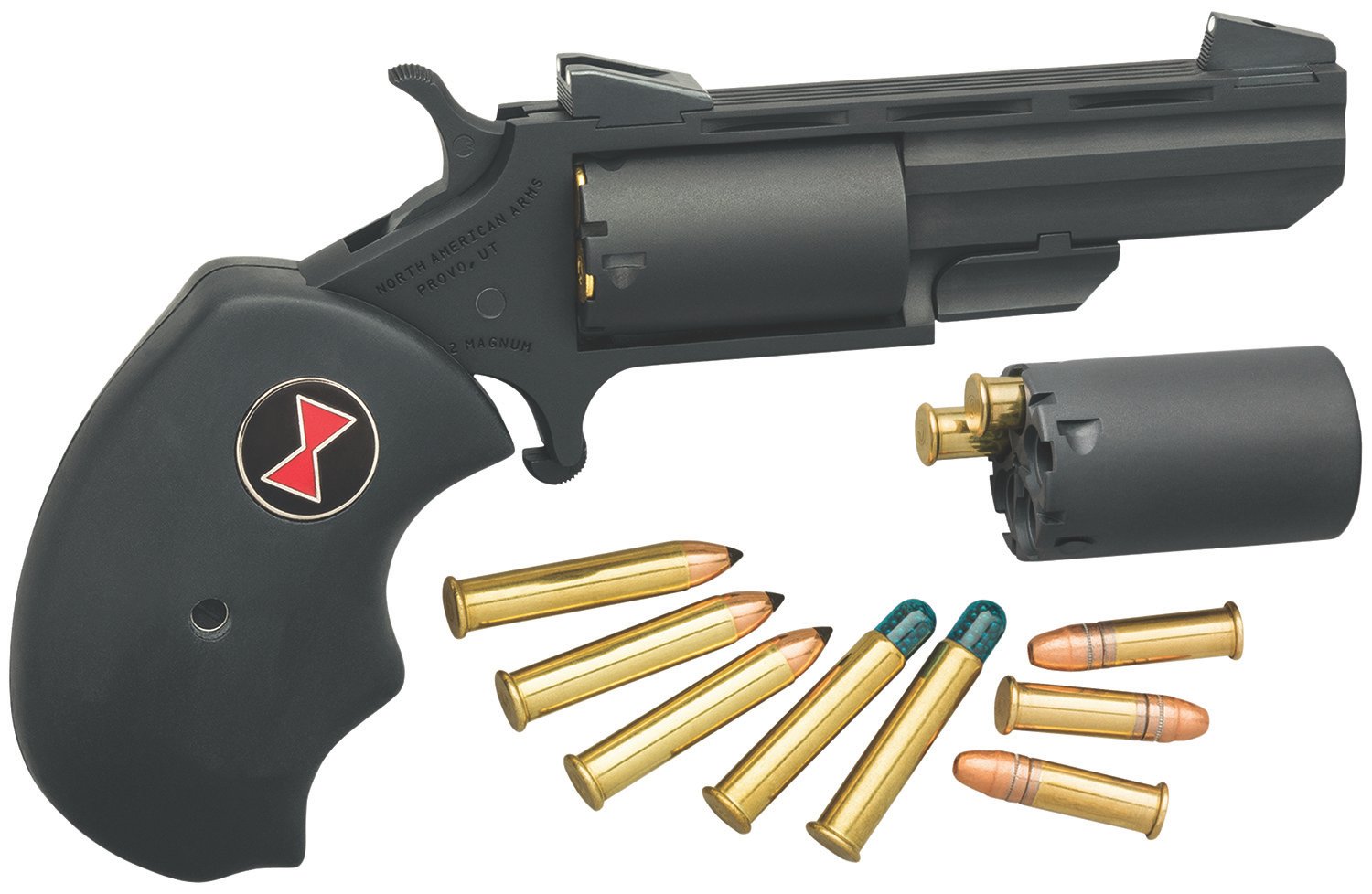 Black Widow revolvers evolved from NAA’s popular .22 Magnum frame series and include the time tested design characteristics that are incorporated in all NAA mini revolvers. The result is enhanced stability and accuracy for the shooter. The Black Widow has a heavy 2″ vent barrel, bull cylinder and fixed low profile sights by Millet. The Black Widow also features oversized black rubber grips sporting the iconic red hourglass shape found on its namesake.