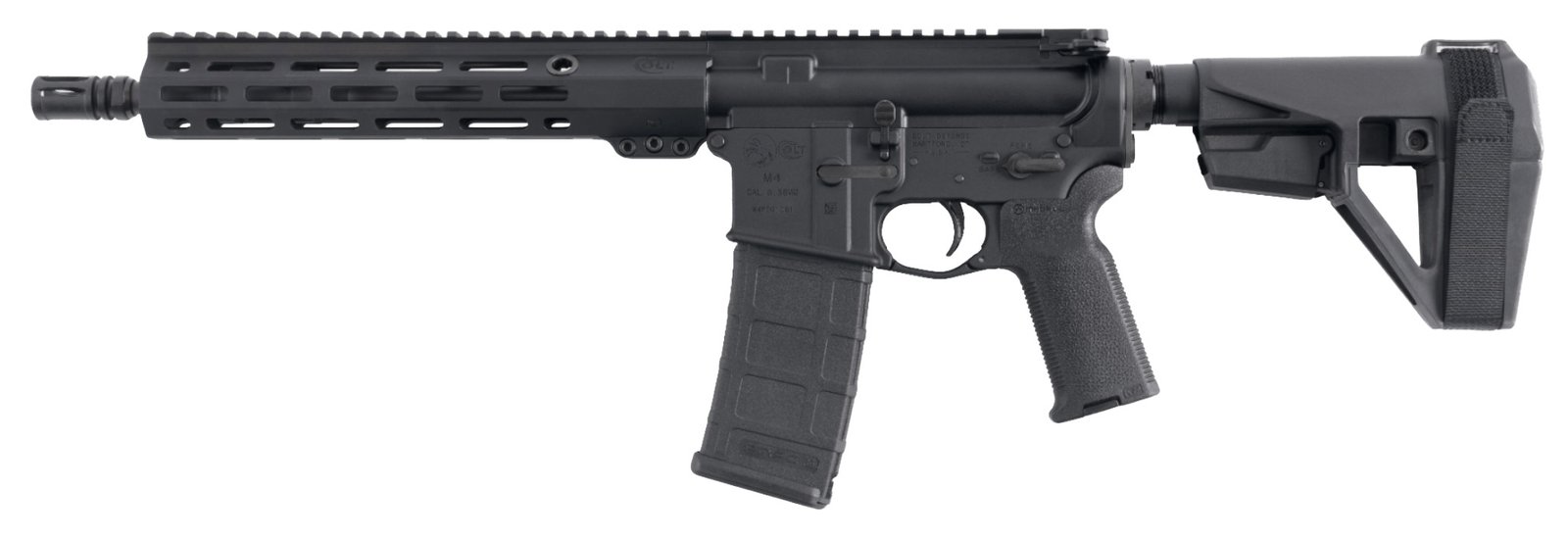 Features – Mil-spec forged 7075 -T6 aluminum upper and lower receivers with mil -spec matte black type -III hard coat anodize finish – Colt free -float rail with Magpul M-LOK features a full length M1913 picatinny top rail and 7 -orientations of M -LOK mounting surfaces. – The rail includes integrated steel QD sling swivel sockets and anti rotation tabs – 10.3 and 11.5 barrel options with manganese phosphate finish and chrome lined. – Direct gas impingement operating system – SBA5 pistol stabilizing brace and 6 -position mil -spec extension – Includes 30rd Magpul PMAG Magazine – Model M4 Pistol – Barrel Length 11.5 – Capacity 30+1 – Caliber 5.56x45mm – Weight 5.9 lbs – Twist Rate 1:7 RH 6 groove – OAL 28-30.5 – Action Semi – Trigger Type Single Stage
