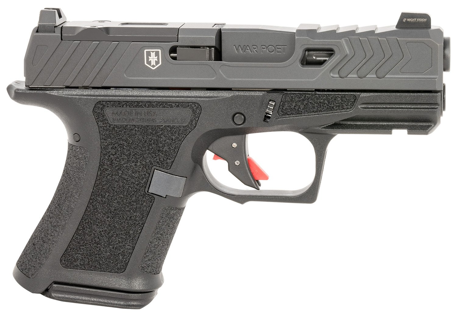 Created by Shadow Systems with John Lovells hand-selected features, the War Poet line of pistols merges Warrior Poet Society’s philosophy with Shadow Systems functionality. War Poet features are in the slide machining. John Lovell selected aggressively angled serrations in front, rear and topside, paired with a weight-balancing window cut. All War Poet models come standard with the patented Shadow Systems multi-footprint optic cut, allowing for direct, strong mounting of most brands of red dot sights; textured wrap around and backstrap; front tritium sight and blacked out steel rear sight; front chevron serrated slide; flat face trigger w/red trigger shoe.