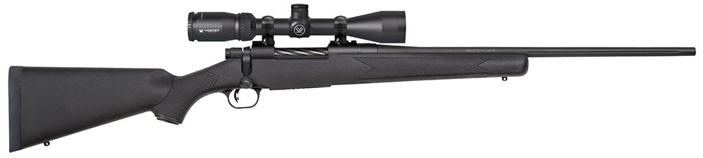 The classically styled Mossberg Patriot looks great on the gun rack and feels great when shouldered. Attractive, accurate and affordable, this bolt-action rifle comes standard with Mossberg’s patented LBA trigger, user adjustable from 2 to 7 lbs and Weaver-style bases. It has a spiral fluted bolt with a knurl pattern to ensure smooth, comfortable and reliable cycling. The 22″ fluted barrel is matte blued and has a recessed crown to ensure accuracy and durability. It comes with a drop box magazine for convenient loading and unloading. This Patriot model has a black synthetic stock and features a 3-9x40mm Vortex Crossfire II scope.