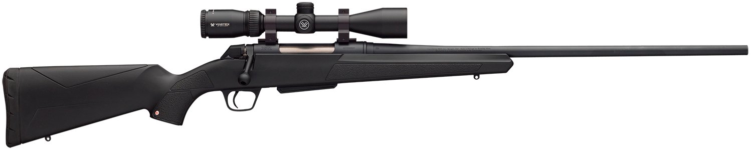 The Winchester XPR is a rugged, no nonsense game-getter that will put meat in your freezer for many years to come. The XPR bolt-action rifle features the M.O.A. Trigger System; two-position safety; bolt release button; one-piece trigger guard and magazine frame design offers a generous guard opening for use with gloves; button-rifled, free-floating barrel; drilled & tapped receiver; synthetic stock with an Inflex Technology recoil pad and a detachable single stack box magazine. Includes a Vortex Crossfire 3-9×40 scope with a BDC reticle. and Weaver rings & bases.