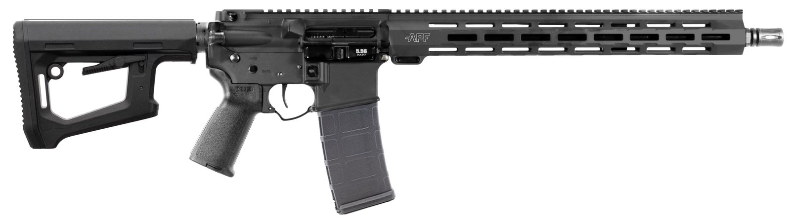 16 4150CM Nitride-Coated Barrel (1:7 Twist) – .750 Mid-Length Gas System – Diamond-Honed Nitride M16 BCG – APF 4.5 lb. Drop-In Trigger – APF Adjustable Gas Block – Magpul MOE PR Stock – Magpul MOE Grip – APF 15 M-Lok Handguard – Forged Receiver – Caliber/ Gauge: 5.56 NATO – Barrel Length: 16 4150CM Nitride- Coated Barrel – Action: Semi-Auto – Front Sight: Rear Sight: None – Color: Black – Finish: Cerakote – Material: Aluminum – Hand: Right