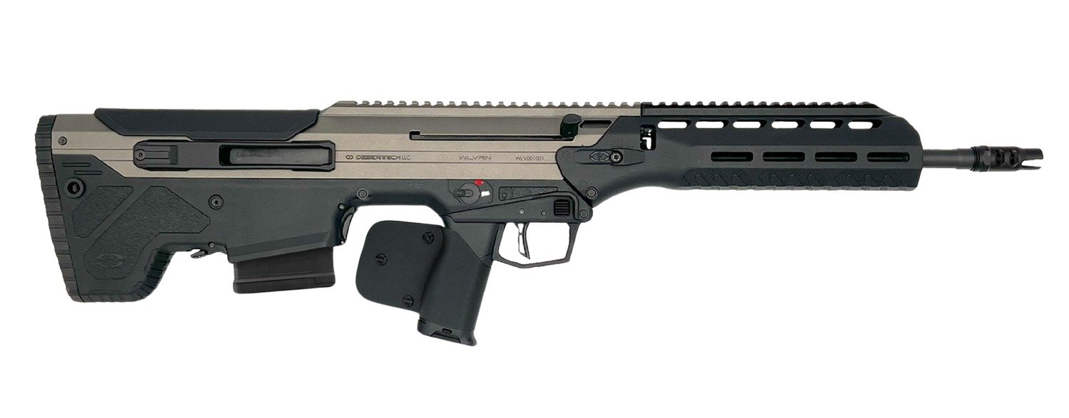 The WLVRN is Desert Tech’s third-generation semi-automatic bullpup rifle platform. The WLVRN features a, integrated receiver; ergonomic platform and the barrel mounting system is machined integrally into the receiver. This design significantly increases the stiffness of the WLVRN’s upper receiver and improves the accuracy of the WLVRN by up to 30%. The WLVRN is the first bullpup that can be converted on-the-go between large and short-frame calibers such as .308 Win and 5.56 NATO