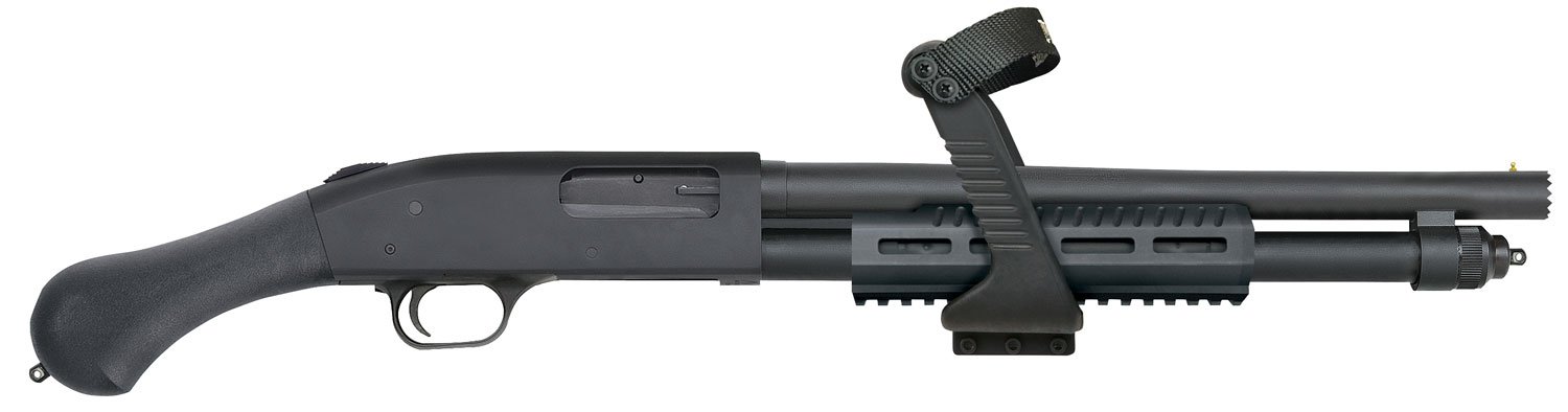 The 590 Shockwave includes all the features that have made Mossberg pump-actions the choice for millions worldwide: ambidextrous safety, dual extractors, positive steel-to-steel lockup, twin action bars, and a smooth operating anti-jam elevator. It has a convenient clean-out tube magazine cap, a front bead sight, and ‘corn cob’ strapped forend to keep shooter’s lead hand clear of the muzzle. The 590 Shockwave Raptor bird’s head pistol grip is uniquely shaped to minimize felt recoil. Classified as fully-compliant by the BATFE, this model has a 26.37″ OAL and requires no Tax Stamp for transfers. The 590 Shock n Saw Shockwave features an aluminum railed forend and signature Chainsaw top grip.