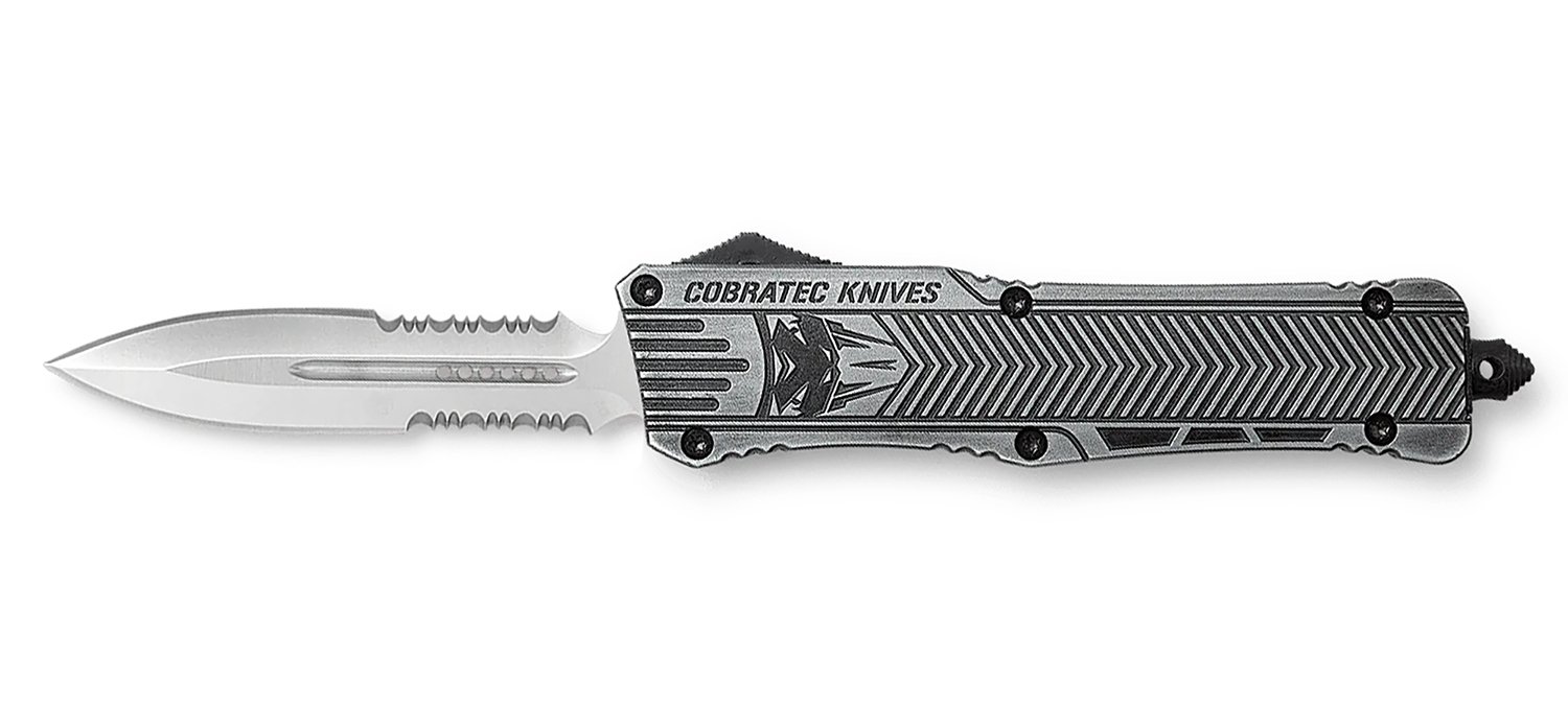 CobraTec Knives LSWCTK1LDG2SS CTK-1 Large 3.75″ OTF Dagger Part Serrated D2 Steel Blade/ Stonewashed Aluminum Handle Features Glass Breaker Includes Pocket Clip