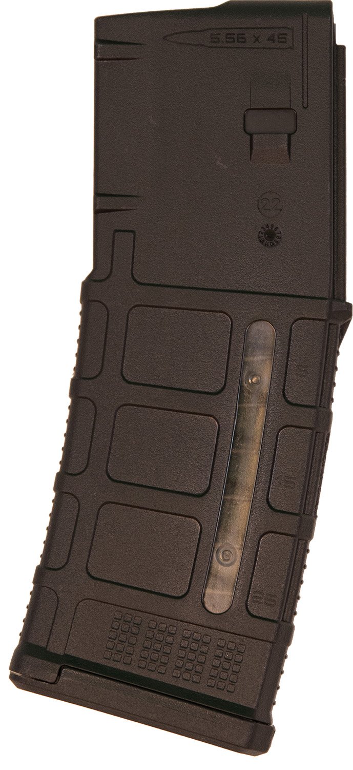 Made in the USA, the PMAG 30 GEN M3 Window is a polymer magazine for AR15/M4 compatible weapons that features transparent windows to allow rapid visual identification of approximate number of rounds remaining. In addition, a redesigned bolt catch notch in the rear of the magazine provides increased bolt catch clearance, while an over-travel stop on the spine helps ensure the magazine will not over-insert on compatible weapons. Low profile ribs and new aggressive front and rear texture gives positive control of the GEN M3 in all environments, and a paint pen dot matrix has been added to the bottom panel of the body to allow easy marking by the end user for identification. The new, easy to disassemble flared floorplate aids extraction and handling of the magazine while providing improved drop protection, but is slightly slimmer than before for better compatibility with tight double and triple magazine pouches. NOTE: This item is also compatible with HK 416/MR556A1/M27 IAR, British SA-80, FN SCARN MK 16/16S, and others.