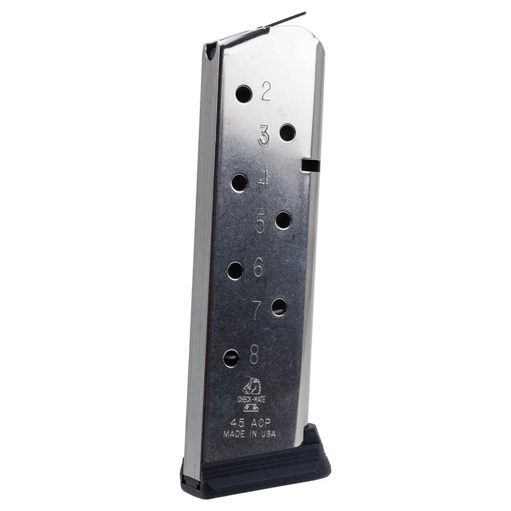 Check-Mate Full Size 1911 8 Round .45 ACP Magazine Stainless. Manufactured from durable steel this magazine is designed by Check-Mate Industries for full-size 1911 pistol platforms chambered in .45 ACP This magazine features a polished stainless finish and boasts a capacity of 8 rounds of .45 ACP cartridges. Each Check-Mate magazine is 100% developed and manufactured in the U.S.A. to ensure superior performance reliability quality fit and finish with your favorite firearm.